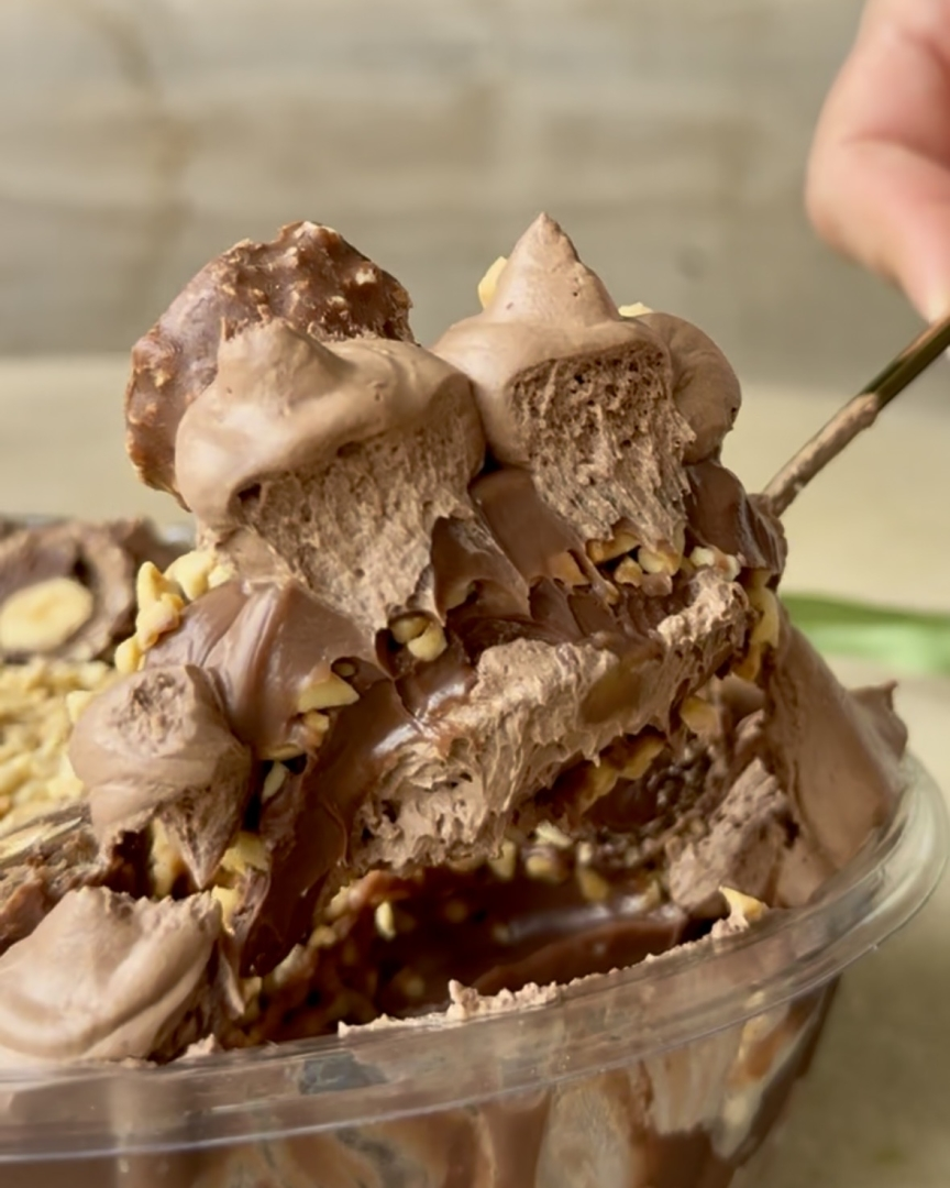 Brigadeiro, mousse de chocolate, bombons Ferrero e Nutella, criando uma combinação rica e extremamente cremosa. 1200g • Serve até 8 pessoas