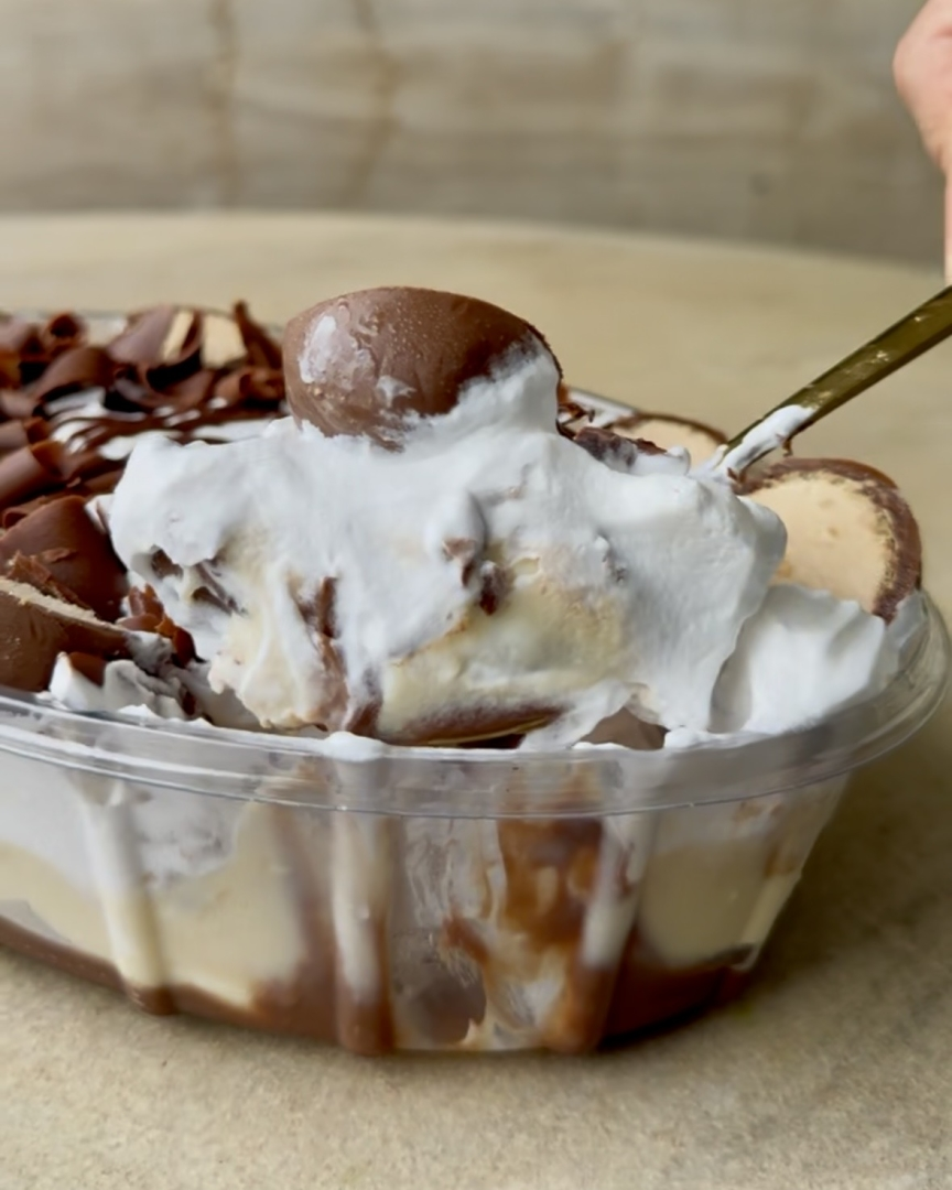 Brigadeiro ao leite combinado com creme belga, pedaços de bombom Sonho de Valsa e chantilly. Clássico, cremoso e irresistível. 1200g • Serve até 8 pessoas