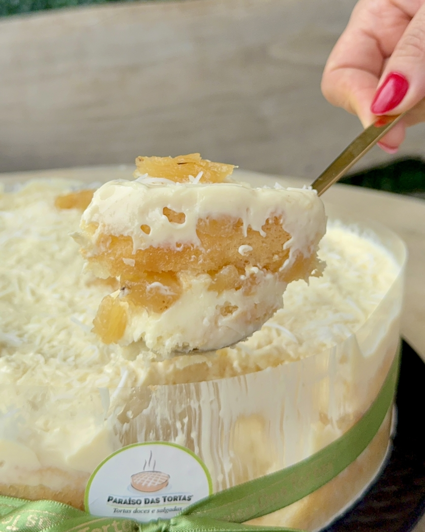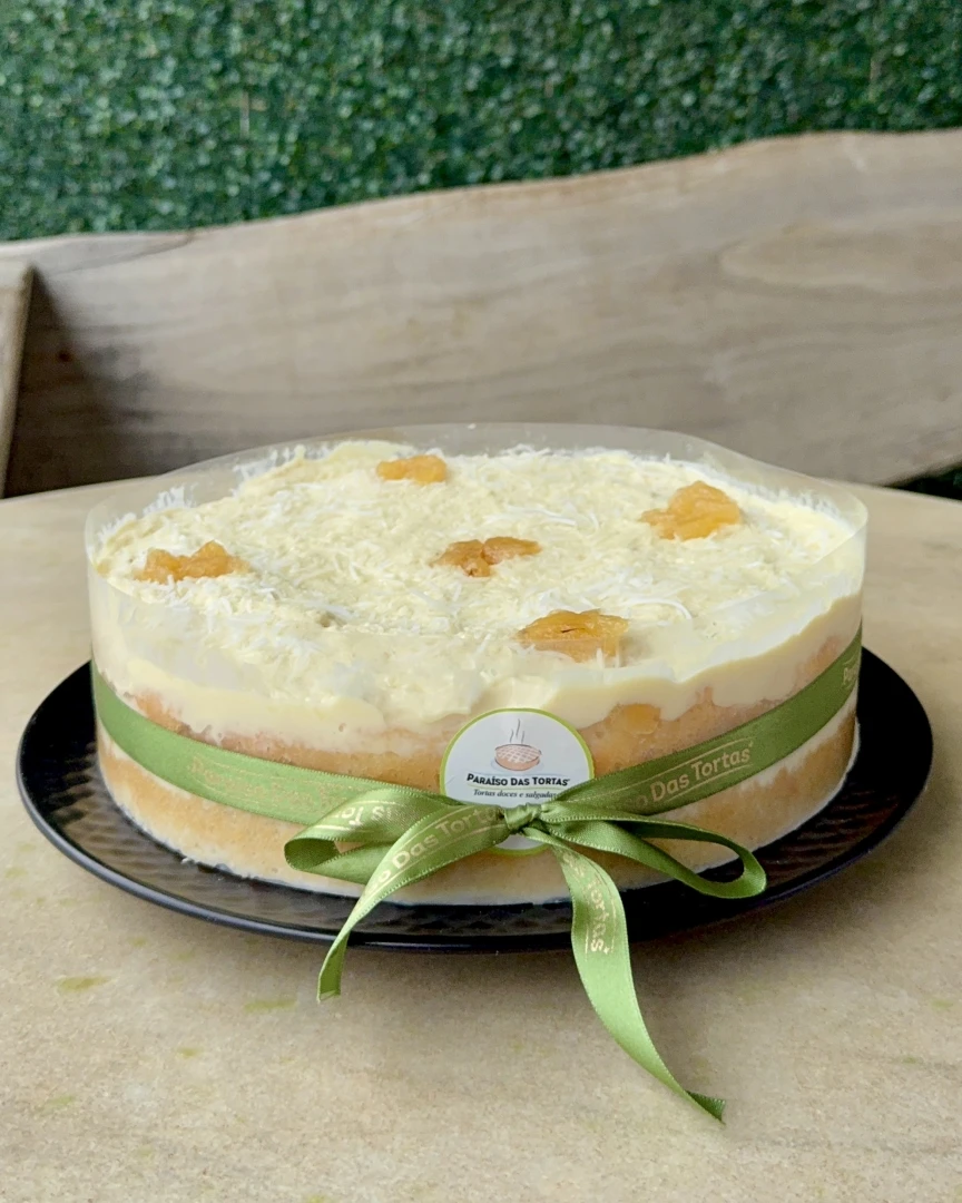 Bolo branco suave e úmido, recheado com creme de coco e um doce de abacaxi saboroso. Na cobertura, creme de Ninho e pedaços de abacaxi para decorar. Peso: 2kg. Serve aproximadamente 15 pessoas.