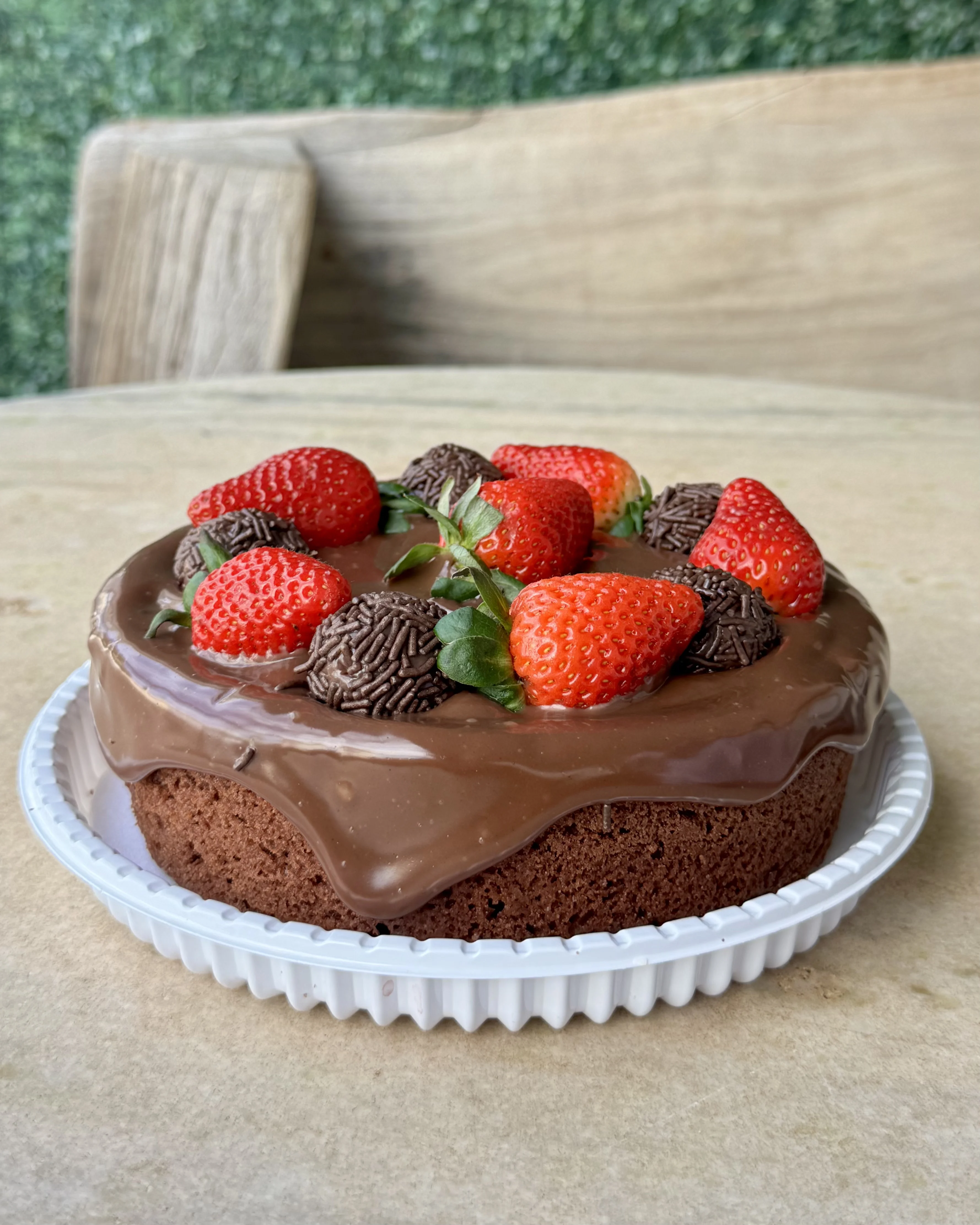Bolinho de chocolate caseiro feito por nós, com uma super cobertura de brigadeiro cremoso, morangos frescos e docinhos de brigadeiro. Incrivel. 1kg. Serve aprox. 8 pedaços