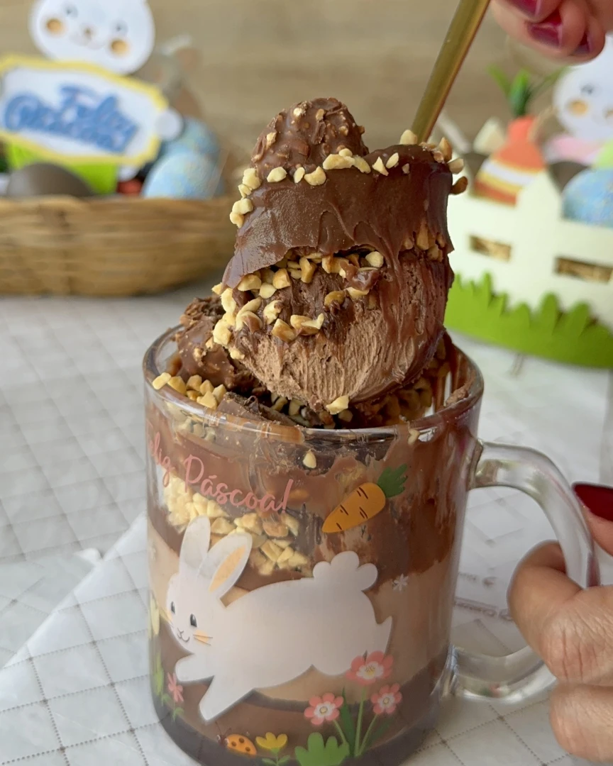 Caneca de Páscoa estilo Ferrero 🍫🐰 Brigadeiro + mousse de chocolate + amendoim crocante + Ferrero Rocher. Feita pra quem não abre mão de muito chocolate. 👉🏼 300g de recheio. 🎁 Caneca exclusiva de Páscoa inclusa — edição limitada.
